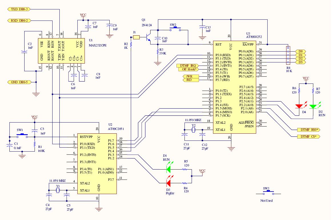 One of the great benefits of going to a telephone system based around a PC, was my ability to write the software in C, and create a Windows application to control everything. I wrote the Windows software portion of this project using Borland's C++ Builder. I still used a 8051 variant, the Atmel AT89S8252, to control some things that for whatever reason I did not want to do via the modem. These included the generation and detection of DTMF tones, and generation of an 'off hook' signal that controlled the state machine within the software. It also gave me an excuse to go ahead and start yet another microcontroller project. That's always a good thing.