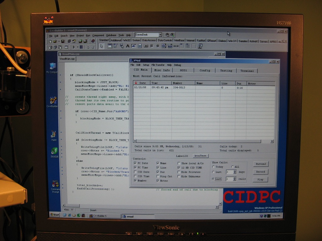 My CID-PC project is a telephone project based around a PC using a US Robotics Sportster Voice modem, the USR5695. At this point it is really only a very elaborate caller ID box, with some advanced features. It logs all the information from both incoming and outgoing calls. For incoming calls this includes the calling number, the called number (I have a few distinctive ring numbers), time & date of call, number of rings, duration of the call, and any DTMF tones detected during the call. For outgoing calls this includes the dialed number, time & date of call, duration of the call, and any DTMF tones detected during the call. I can instantly (well, almost) sort all of my phone records based on any of the saved information, as well as display the data in a variety of ways.