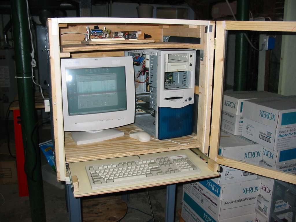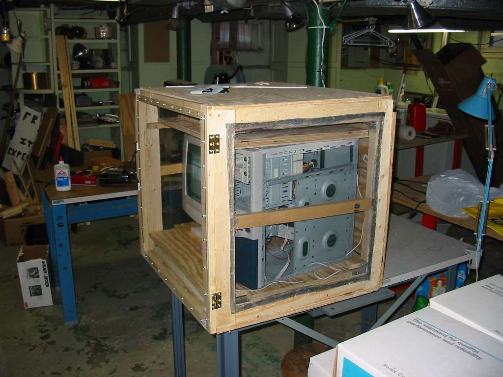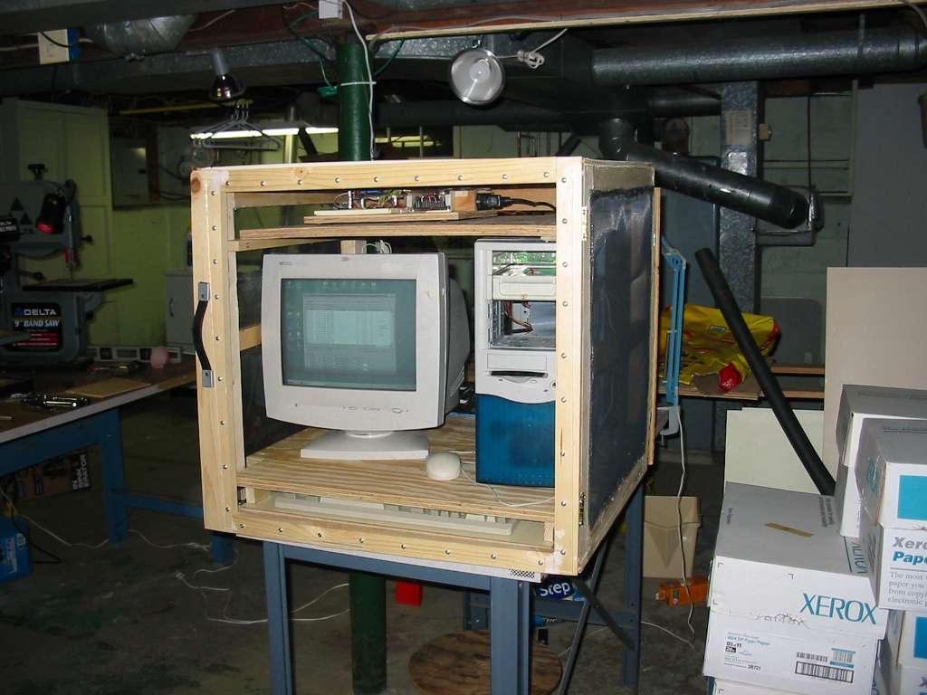 When I first conceived of this project I figured I'd want it in my basement. The extra PC wouldn't take up space in my work room, and I wouldn't be bothered by the extra noise of the fans in the PC (I hate that). I knew if I put it in the basement it would become home to all sorts of bugs that wanted a slightly warmer home. So, I built a wood and screen enclosure to keep everything in. Yes, that was a hell of a lot of work to do. I built it in the basement and ... almost made it too big to be taken up the stairs. I ran some cable from my second floor work room, up into the attic, across the attic, then down to the basement alongside the heating ducts. I then interfaced to the PC in the basement with Windows peer-to-peer networking and VNC Viewer.