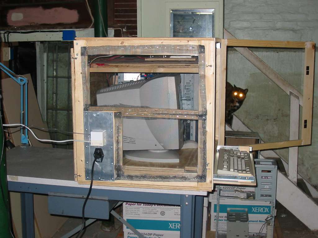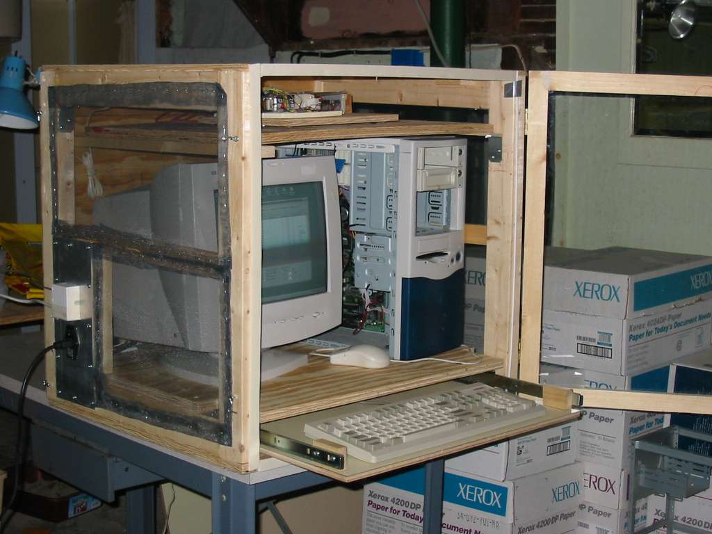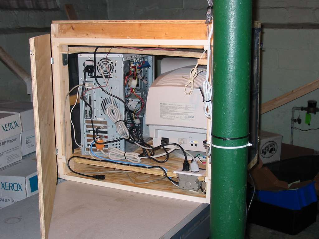 When I first conceived of this project I figured I'd want it in my basement. The extra PC wouldn't take up space in my work room, and I wouldn't be bothered by the extra noise of the fans in the PC (I hate that). I knew if I put it in the basement it would become home to all sorts of bugs that wanted a slightly warmer home. So, I built a wood and screen enclosure to keep everything in. Yes, that was a hell of a lot of work to do. I built it in the basement and ... almost made it too big to be taken up the stairs. I ran some cable from my second floor work room, up into the attic, across the attic, then down to the basement alongside the heating ducts. I then interfaced to the PC in the basement with Windows peer-to-peer networking and VNC Viewer.